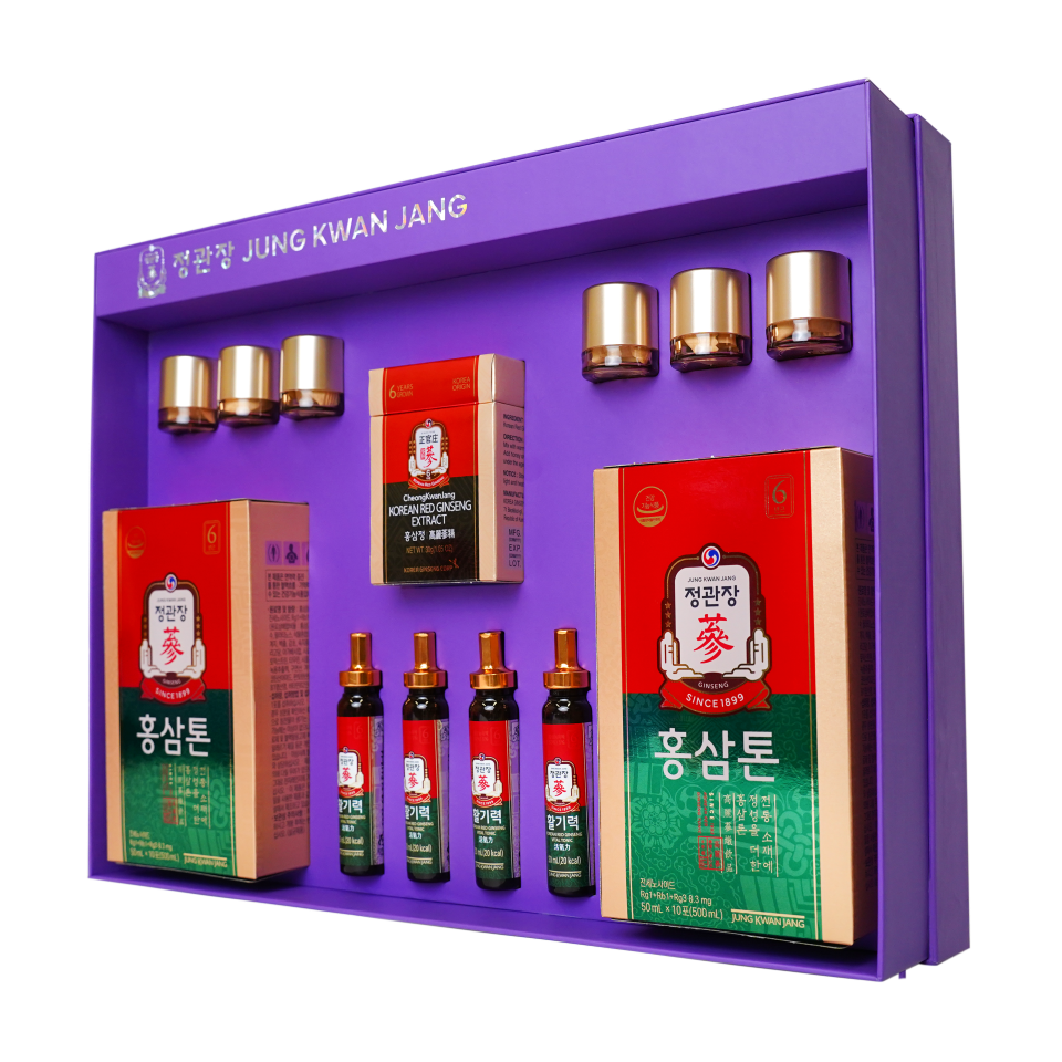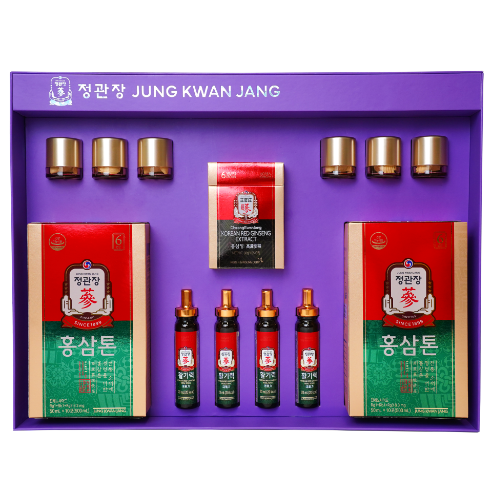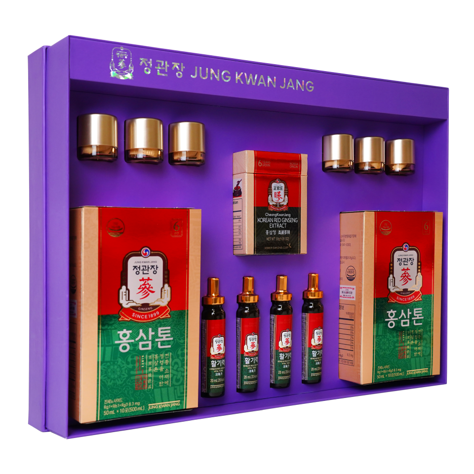 Bộ quà hội tụ những sản phẩm cao cấp nhất của Jung Kwan Jang, mang lời chúc tài lộc – sức khỏe – vững vàng – viên mãn.